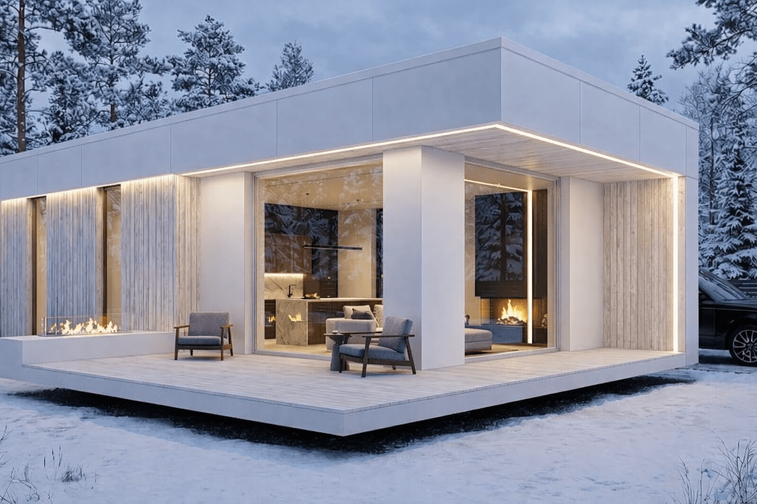 тот белый цвет: Он выглядит дорого. Он контрастирует с зимним лесом и выделяется на фоне серых «ульев» соседей. Это как белоснежный костюм на деловой встрече — все взгляды будут только на тебе. Световые линии: Посмотри на эту контурную подсветку. Это уровень лучших отелей Дубая. Ночью этот дом будет светиться как настоящий драгоценный камень. Это то, за что люди переплачивают, не задумываясь. Терраса-подиум: Она парит! Это создает ощущение легкости и технологичности. Это идеальное место, чтобы стоять с бокалом виски и смотреть на тех, кто всё еще ждет подключения газа. Остекление: Огромные окна. Внутри всё как на ладони, но это «умная» открытость. Это говорит о том, что владельцу нечего скрывать, он — хозяин этой жизни.
