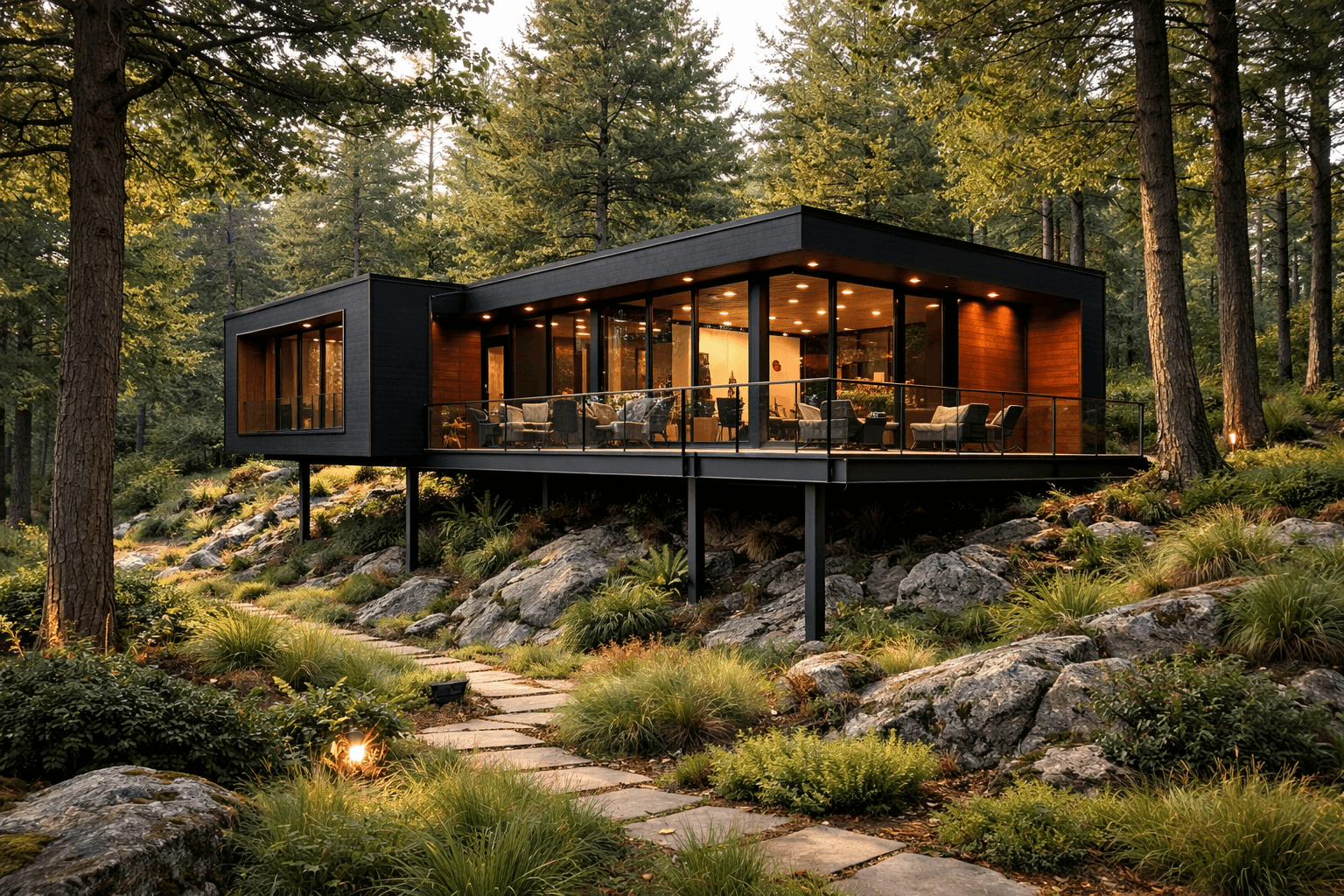 Дом сливается с природой, но при этом доминирует над ней. Он «парит» над ландшафтом. Это сложнее, это дороже, и это выглядит невероятно. Это не просто дом на участке, это дом, который подчинил себе участок. Огромная терраса с теплым светом. Это идеальное место для закрытых вечеринок и важных переговоров. Это «Штаб-квартира в лесу и уютное место силы в одном манифесте не нарушающим законы природы.